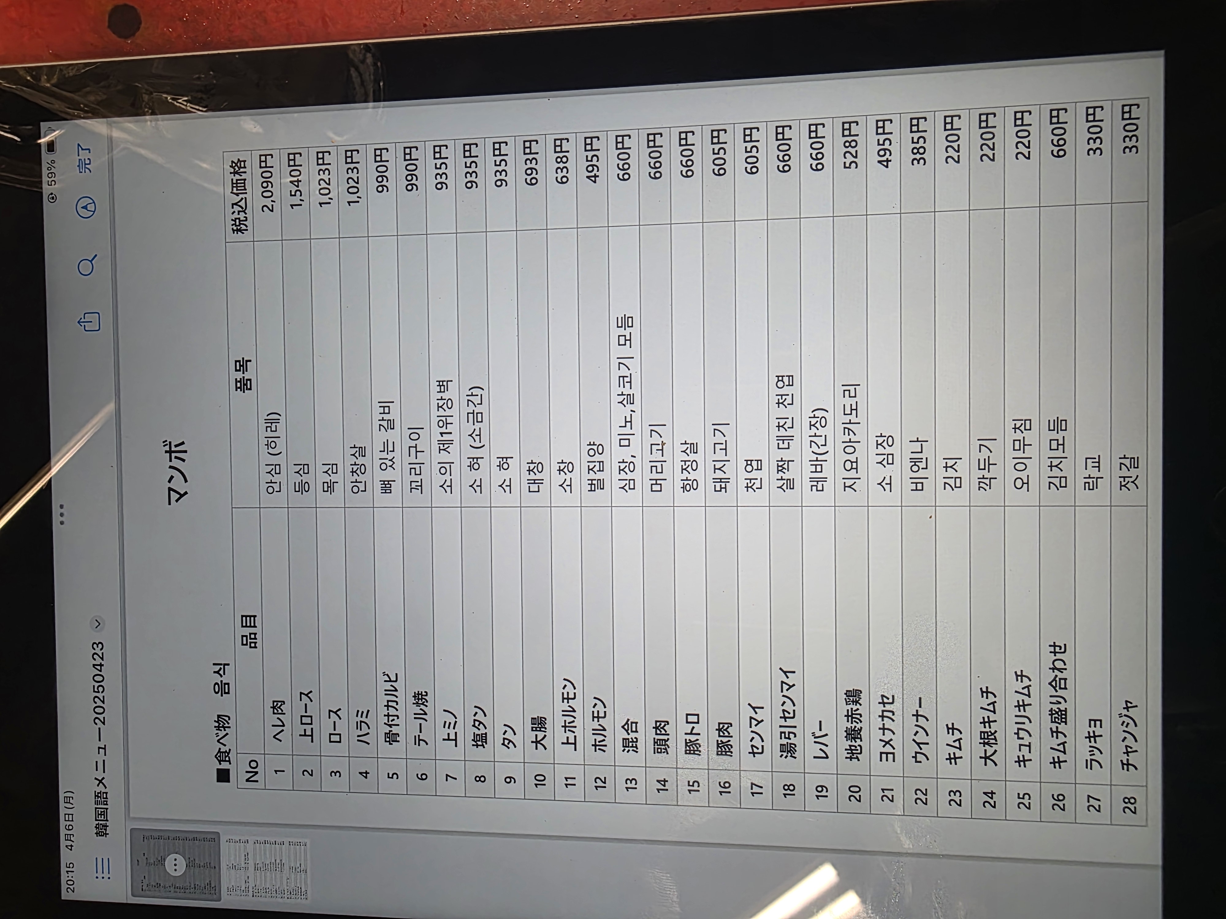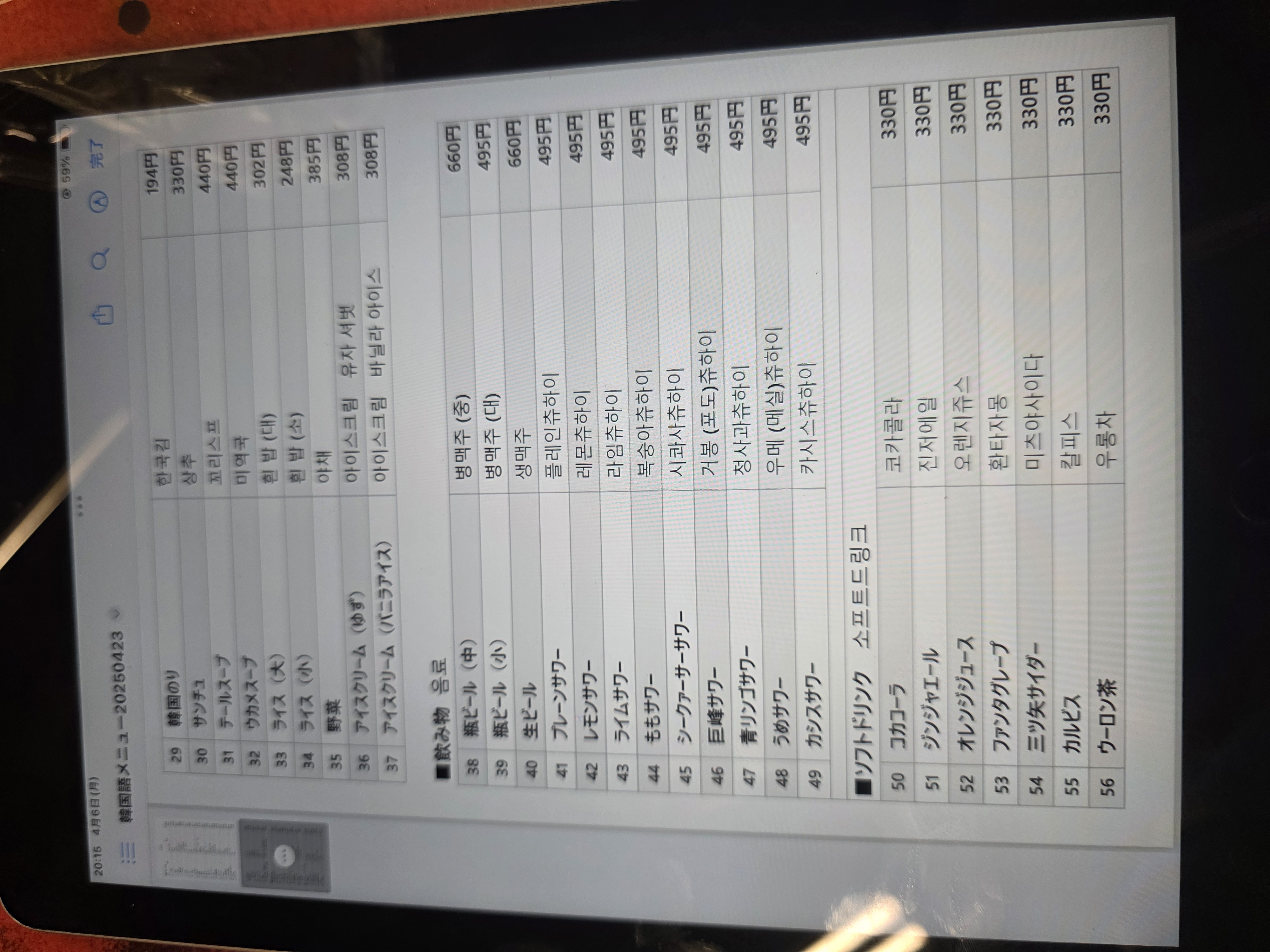 앉으라는 자리 앉으니 태블릿에 한국어 메뉴판 켜져 있었습니다.